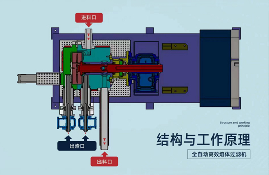 • 物料從入料口進(jìn)入熔體腔,經(jīng)過(guò)濾板過(guò)濾,不同目數(shù)合格的物料從出料口流出